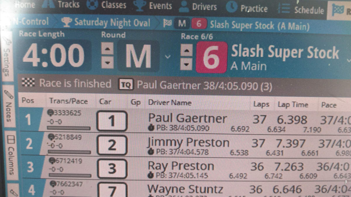 There are three vital pieces of data at the top of the screen that I haven’t covered, and although they’re obvious I feel the need to mention them for completeness. The Race Number is highlighted with a block of the class color, and most racers will track their own participation by race number… so they need to know what the current race is. The Next Race is also up here, if there is one. If the class of the next race has multiple heats, you’ll see that in this data as “(1/2)”, which means the next race is the first or two heats. Both of these things should be called at least twice in a race. The TQ is up here too, as “person: laps/time”. You should say this in your race intro, and probably again in the wrap-up. If a driver in the current race has a laps/time that beats the current TQ, a little TQ badge will appear to the left of their name in the Trans/Pace column. Every driver exceeding the TQ run will have this badge, so it doesn’t mean they will BE the TQ.