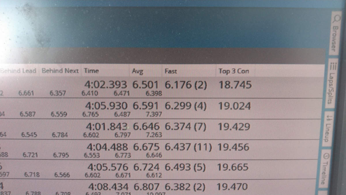 As the race winds down, the column Avg can become important. If a driver it approaching some milestone – TQ, personal best run, getting onto an additional lap – you can use Avg to provide additional information. For example, if a driver needs to pick up 0.3 seconds to take the TQ and has three clicks left, you know that they need to gain 0.1 seconds each lap. From what? Their average lap time, in Avg. If this driver’s Avg is 15.9, they can take TQ by beating 15.8 in each of their final 3 laps. This is especially useful to you if there really isn’t anything else interesting to patter on, and the driver will appreciate the information you provide.